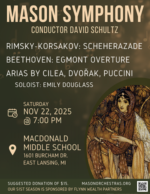 Donation checks can be made out to "Mason Orchestral Society" and mailed to: Mason Orchestral Society, P.O. Box 473, Mason, MI 48854-0473